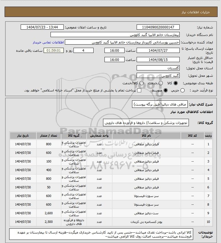 | 3 | -- | فیلتر دیالیز صفاقی | عدد | تجهیزات پزشکی و سلامت | 100 | 1404/07/30 |