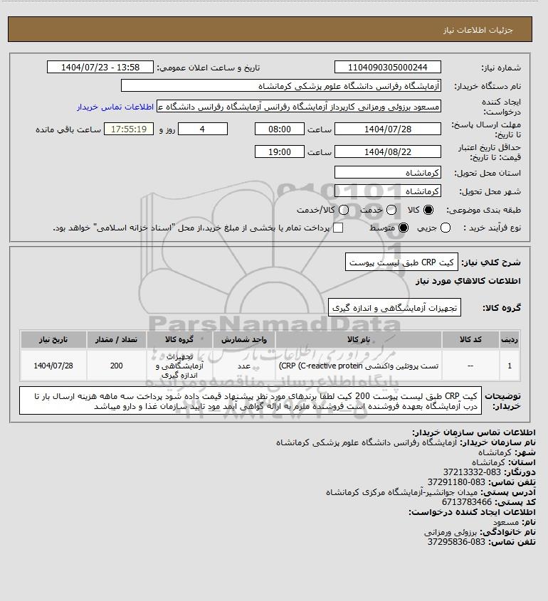 شرح کلی نیاز: کیت CRP طبق لیست پیوست