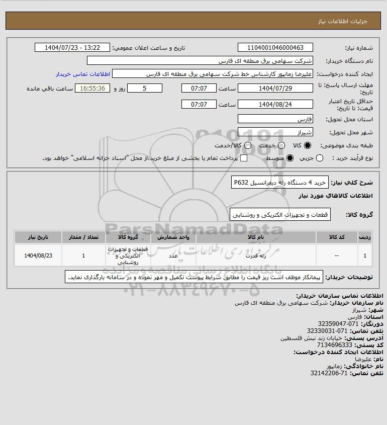 شرح کلی نیاز: خرید 4 دستگاه رله دیفرانسیل P632