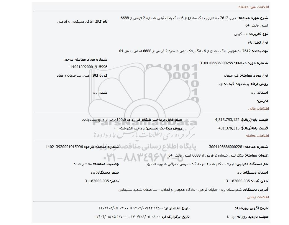 مزایده 7612 ده هزارم دانگ مشاع از 6 دانگ پلاک ثبتی شماره 2 فرعی از 6688 اصلی بخش 04, مزایده، 7612 ده هزارم دانگ مشاع از 6 دانگ پلاک ثبتی شماره 2 فرعی از 6688 اصلی بخش 04