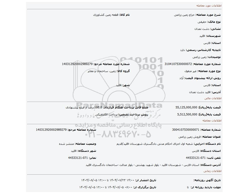 | شرح مورد معامله: حراج زمین زراعی | نام کالا: قطعه زمین کشاورزی | |