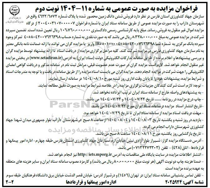 سازمان جهاد کشاورزی استان فارس در نظر دارد فروش شش دانگ زمین محصور شده با پلاک شماره 4622/6572 واقع در شهرستان داراب را بصورت مزایده عمومی از طریق سامانه ستاد ایران با شماره فراخوان 2004003107000007 از درگاه مزایده اموال غیر منقول به فروش رساند. مبلغ پایه کارشناسی رسمی دادگستری 106.760.000.000 ریال تعیین شده است. تضمین سپرده شرکت در مزایده عمومی به مبلغ 5.338.000.000 ریال میباشد که بصورت نقدی به شماره حساب 4058042007626398 تمرکز وجوه سپرده بانک مرکزی به شماره شبا IR550100004058042007626398 واریز یا مزایده گران میتوانند با ارائه ضمانت نامه بانکی معتبر بنام سازمان جهاد کشاورزی فارس در مزایده شرکت کنند. کلیه مراحل برگزاری مزایده از دریافت اسناد تا ارائه پیشنهاد توسط مزایده گران و بررسی پیشنهادها و اعلام برنده از طریق سامانه تدارکات الکترونیکی دولت ستاد ایران به آدرس ستاد ایران در بخش مزایده غیر منقول انجام خواهد شد. لازم است مزایده گران در صورت عدم عضویت قبلی مراحل ثبت نام در سامانه مذکور و دریافت گواهی امضای الکترونیکی را جهت شرکت در مزایده انجام دهند. مزایده گران میبایست اسناد مزایده را از طریق سامانه دریافت و با توجه به مندرجات اسناد و شرایط مزایده، پیشنهادات خود را تا پایان وقت اداری روز شنبه مورخ 1404.08.10 در سامانه ارسال نمایند.