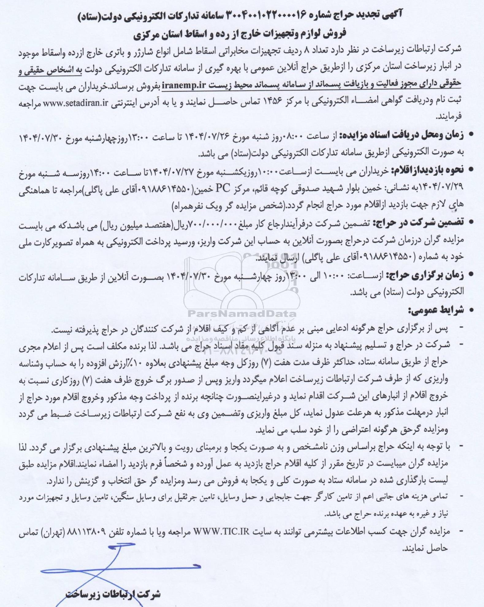 شرکت ارتباطات زیر ساخت در نظر دارد تعداد 8 ردیف تجهیزات مخابراتی اسقاط شامل انواع شارژر و باتری خارج از رده و اسقاط موجود در انبار زیر ساخت استان مرکزی را از طریق حراج آنلاین عمومی با بهره گیری از سامانه تدارکات الکترونیکی دولت به اشخاص حقیقی و حقوقی دارای مجوز فعالیت و بازیافت پسماند از سامانه پسماند محیط زیست iranemp.ir بفروش برساند. خریداران می بایست جهت ثبت نام و دریافت گواهی امضاء الکترونیکی با مرکز 1456 تماس حاصل نمایند و یا به آدرس اینترنتی ستاد ایران مراجعه فرمایند.