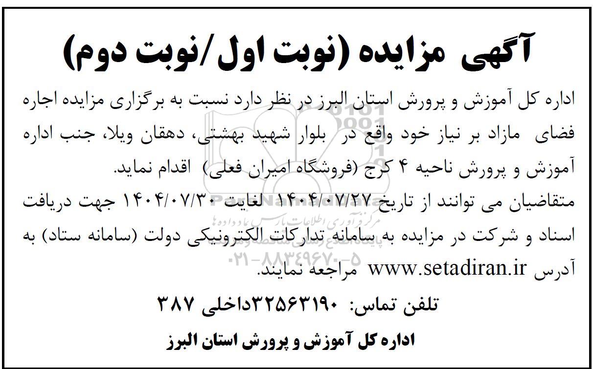 اداره کل آموزش و پرورش استان البرز در نظر دارد نسبت به برگزاری مزایده اجاره فضای مازاد بر نیاز خود واقع در بلوار شهید بهشتی دهقان ویلا جنب اداره آموزش و پرورش ناحیه 4 کرج فروشگاه امیران فعلی اقدام نماید.