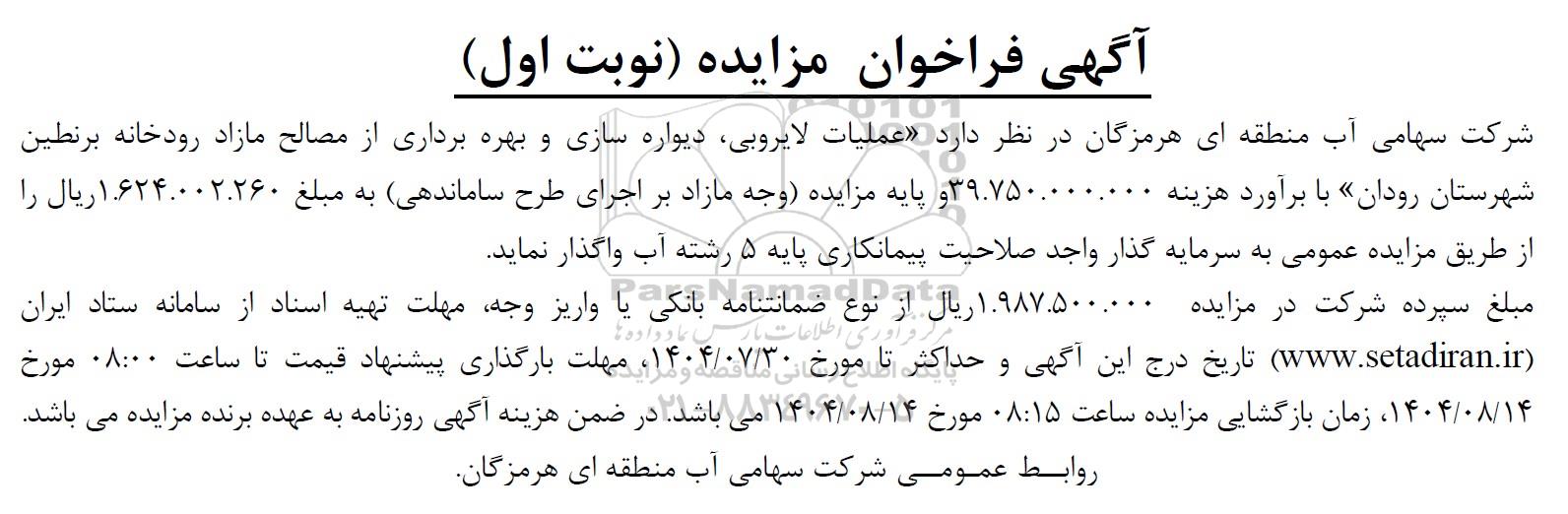 شرکت سهامی آب منطقه ای هرمزگان در نظر دارد (عملیات لایروبی، دیواره سازی و بهره برداری از مصالح مازاد رودخانه برنطین شهرستان رودان) با برآورد هزینه 39.750.000.000 و پایه مزایده وجه مازاد بر اجرای طرح ساماندهی به مبلغ 1.624.002.260 ریال را از طریق مزایده عمومی به سرمایه گذار واجد صلاحیت پیمانکاری پایه 5 رشته آب واگذار نماید.