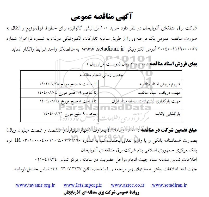شرکت برق منطقه ای آذربایجان در نظر دارد خرید 100 تن نبشی گالوانیزه برای خطوط فوق توزیع و انتقال به صورت مناقصه عمومی یک مرحله ای را از طریق سامانه تدارکات الکترونیکی دولت به شماره فراخوان شماره 2004001119000056 آدرس الکترونیکی سایت ستاد ایران به مناقصه گر واجد شرایط واگذار نماید.