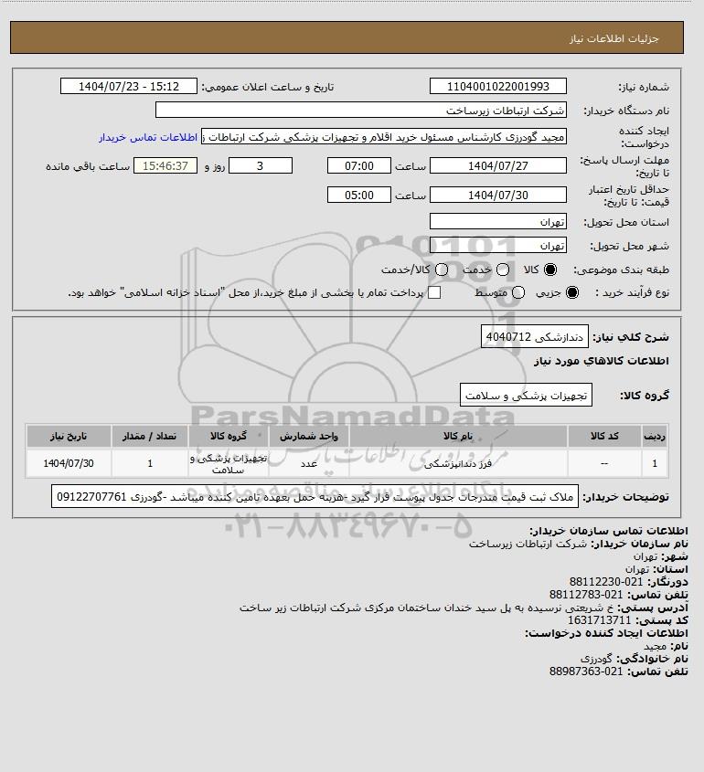 استعلام بها و موضوع استعلام استعلام دندازشکی 4040712 به اطلاع کلیه شرکتها و افراد متخصص واجد شرایط میرساند، آگهی گذار در نظر دارد از طریق استعلام بها، نسبت به انتخاب و دریافت پیشنهادات اقدام نماید. این استعلام با کد آگهی ثبت شده در سامانه خبرگزاری پارس نماد : 9706097 منتشر شده است. مشخصات استعلام : تاریخ شروع استعلام: 1404/07/23 آخرین مهلت ارسال پیشنهاد قیمت : 1404/07/27 و محل اجرای پروژه : استان تهران میباشد. استعلام قیمت مورد درخواست : استعلام دندازشکی 4040712 با دستهبندیهای تخصصی و گروه های مرتبط : خدمات و تجهیزات آزمایشگاهی و پزشکی, استعلام اطلاع رسانی میگردد.