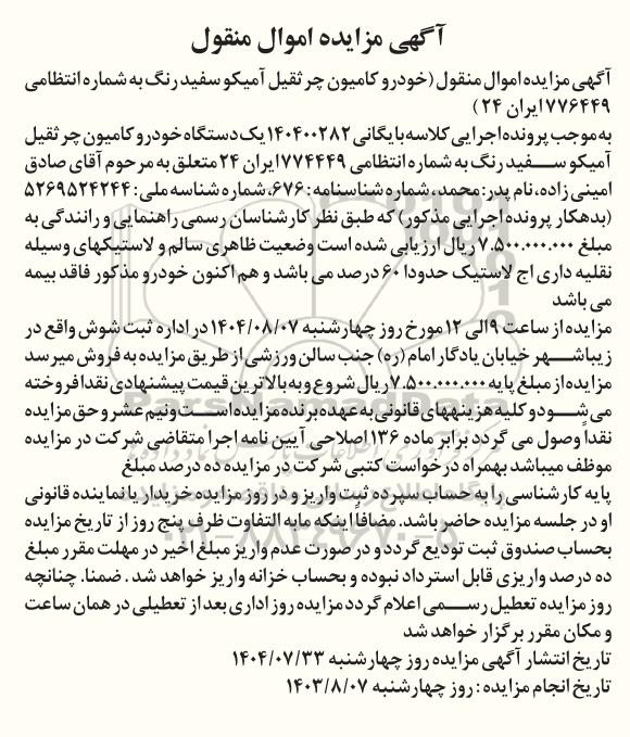 آگهی مزایده اموال منقول خودرو کامیون چرثقیل آمیکو سفید رنگ به شماره انتظامی 77449 ایران 24