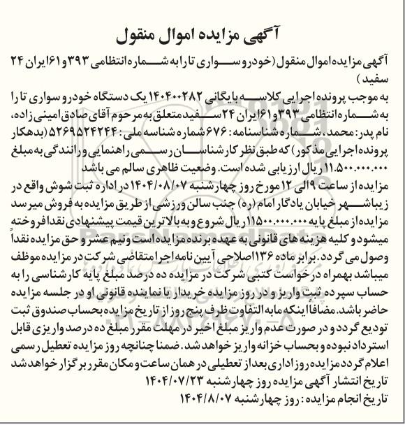 آگهی مزایده اموال منقول خودرو سواری تا را به شماره انتظامی 393 و 61 ایران 24 سفید