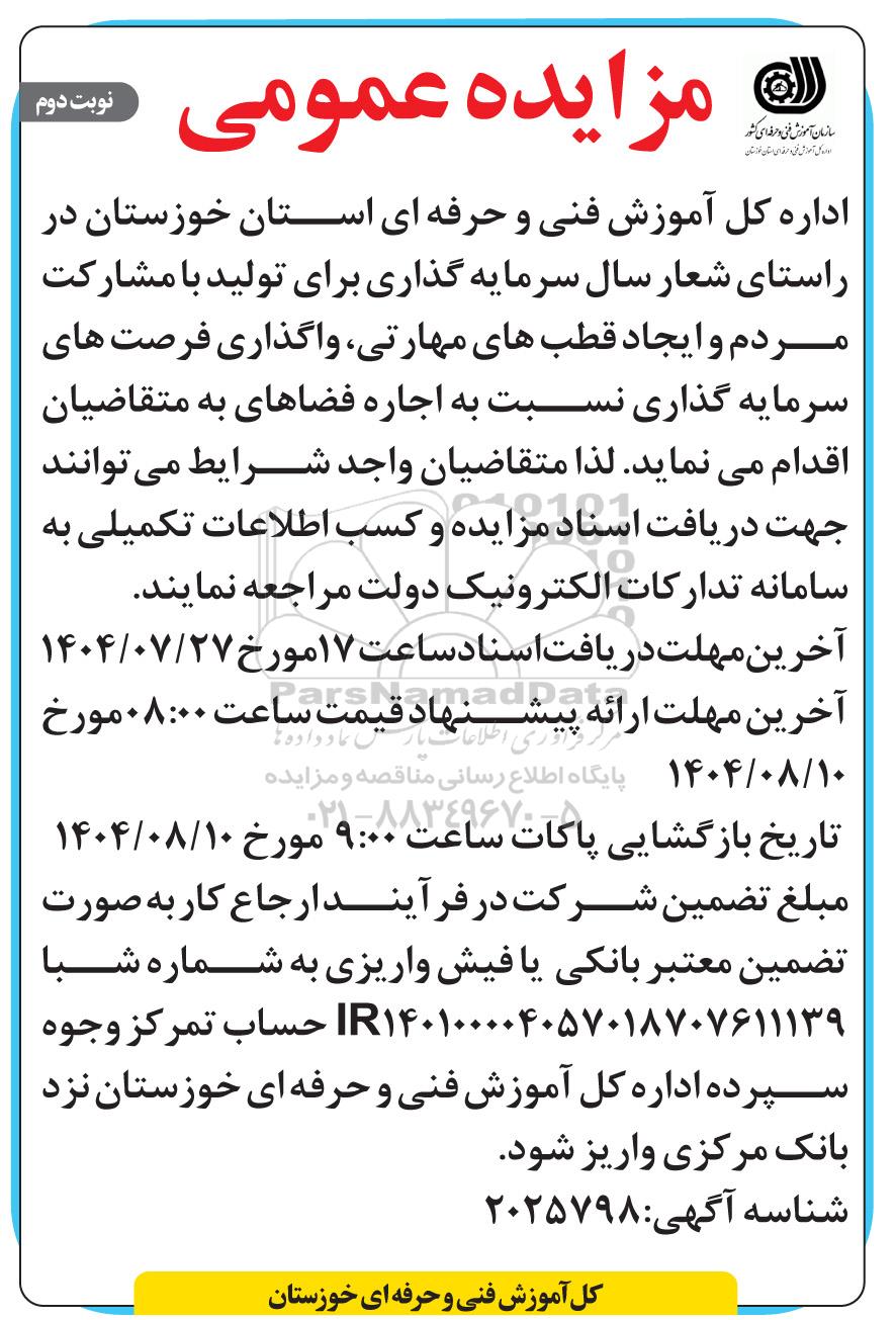 اداره کل آموزش فنی و حرفه ای استان خوزستان در راستای شعار سال سرمایه گذاری برای تولید با مشارکت مردم و ایجاد قطبهای مهارتی، واگذاری فرصت های سرمایه گذاری نسبت به اجاره فضاهای به متقاضیان اقدام می نماید .لذا متقاضیان واجد شرایط میتوانند جهت دریافت اسناد مزایده و کسب اطلاعات تکمیلی به سامانه تدارکات الکترونیک دولت مراجعه نمایند.