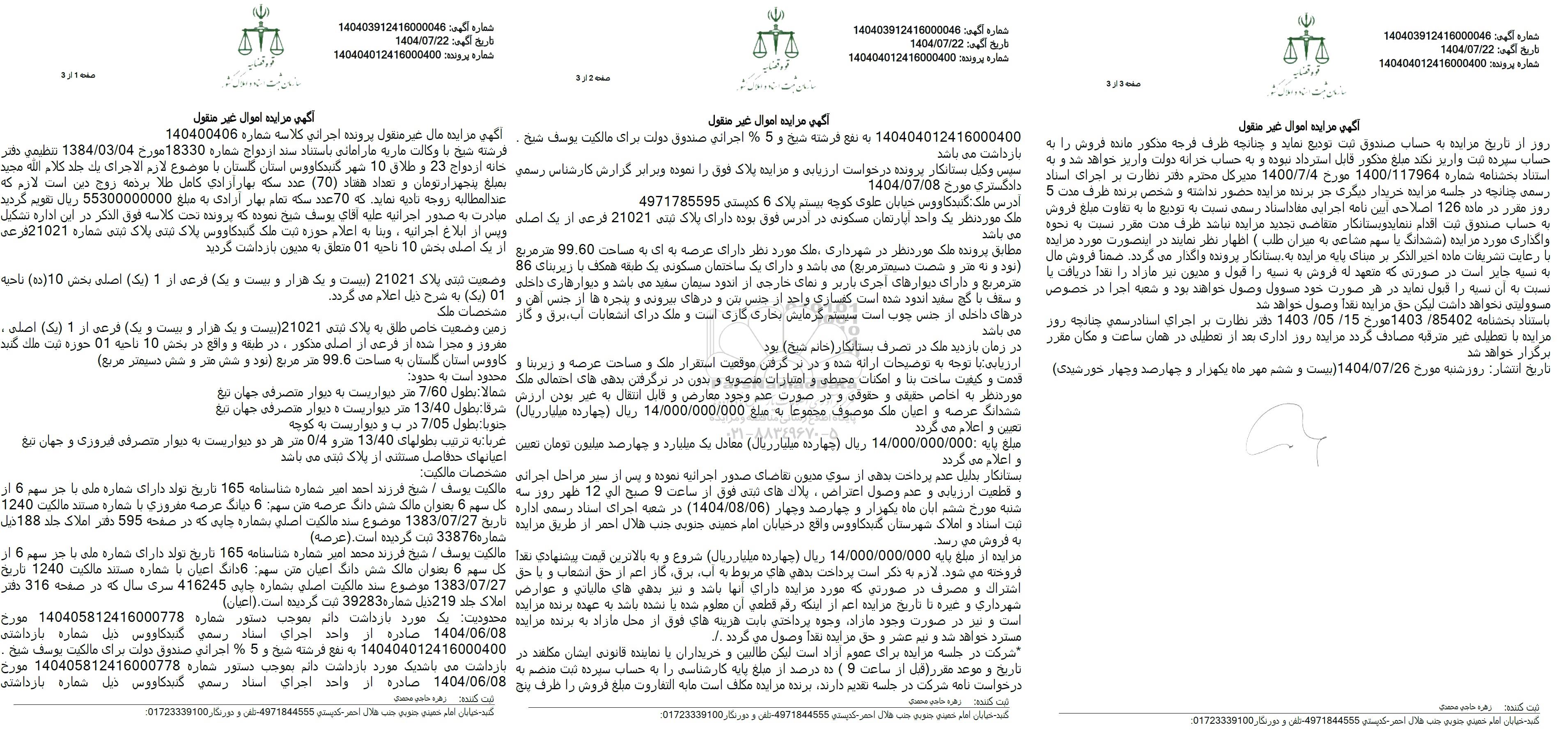 مزایده فروش زمین به پلاک ثبتی 21021 (بیست و یک هزار و بیست و یک) فرعی از 1 اصلی مفروز و مجزا شده از فرعی از اصلی مذکور در طبقه و واقع در بخش 10 ناحیه 01 حوزه ثبت ملک گنبدکاووس استان گلستان به مساحت 99.6 مترمربع به مبلغ 14.000.000.000 ریال