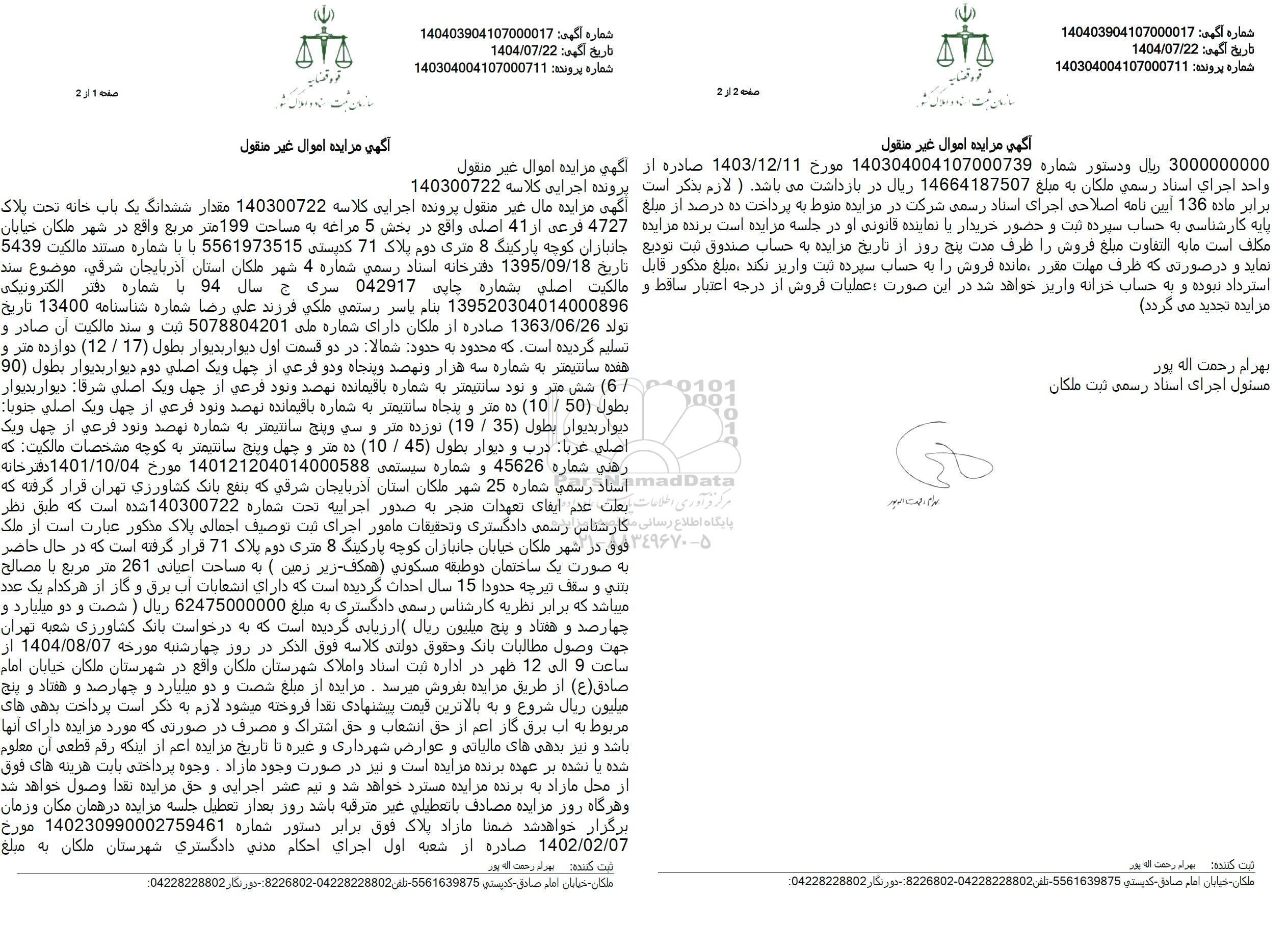 آگهی مزایده مال غیر منقول پرونده اجرایی کلاسه 140300722 مقدار ششدانگ یک باب خانه تحت پلاک 4727 فرعی از 41 اصلی واقع در بخش 5 مراغه به مساحت 199 متر مربع واقع در شهر ملکان خیابان جانبازان کوچه پارکینگ 8 متری دوم پلاک 71 کدپستی 5561973515 با با شماره مستند مالکیت 5439 تاریخ 1395.9.18 دفترخانه اسناد رسمی شماره 4 شهر ملکان استان آذربایجان شرقی موضوع سند مالکیت اصلی بشماره چاپی 042917 سری ج سال 94 با شماره دفتر الکترونیکی 139520304014000896 بنام یاسر رستمی ملكی فرزند علی رضا شماره شناسنامه 13400 تاریخ تولد 1363.6.26 صادره از ملکان دارای شماره ملی 5078804201 ثبت و سند مالکیت آن صادر و تسلیم گردیده است که محدود به حدود شمالا در دو قسمت اول دیوار بدیوار بطول (17) / (12) دوازده متر و هفده سانتیمتر به شماره سه هزار و نهصد و پنجاه و دو فرعی از چهل و یک اصلی دوم دیوار بدیوار بطول (90) / 6 شش متر و نود سانتیمتر به شماره باقیمانده نهصد و نود فرعی از چهل و یک اصلی شرقا دیوار بدیوار بطول 50 / (10) ده متر و پنجاه سانتیمتر به شماره باقیمانده نهصد و نود فرعی از چهل و یک اصلی جنوبا دیوار بدیوار بطول (35) / (19) نورده متر و سی و پنج سانتیمتر به شماره نهصد و نود فرعی از چهل و یک اصلی غربا درب و دیوار بطول (45) / (10) ده متر و چهل و پنج سانتیمتر به کوچه مشخصات مالکیت که رهنی شماره 45626 و شماره سیستمی 140121204014000588 مورخ 1401/10/04 دفتر خانه استاد رسمی شماره 25 شهر ملکان استان آذربایجان شرقی که بنفع بانک کشاورزی تهران قرار گرفته که بعلت عدم ایفای تعهدات منجر به صدور اجراییه تحت شماره 140300722 شده است که طبق نظر کارشناس رسمی دادگستری و تحقیقات مامور اجرای ثبت توصیف اجمالی پلاک مذکور عبارت است از ملک فوق در شهر ملکان خیابان جانبازان کوچه پارکینگ 8 متری دوم پلاک 71 قرار گرفته است که در حال حاضر به صورت یک ساختمان دو طبقه مسکونی همکاف زیر زمین ) به مساحت اعیانی 261 متر مربع با مصالحبنتی و سقف تیرچه حدودا 15 سال احداث گردیده است که دارای انشعابات آب برق و گاز از هر کدام یک عدد میباشد که برابر نظریه کارشناس رسمی دادگستری به مبلغ 62475000000 ریال ) شصت و دو میلیارد و چهارصد و هفتاد و پنج میلیون ریال ( ارزیابی گردیده است که به درخواست بانک کشاورزی شعبه تهران جهت وصول مطالبات بانک و حقوق دولتی کلاسه فوق الذکر در روز چهارشنبه مورخه 1404.8.7 از ساعت 9 الى 12 ظهر در اداره ثبت اسناد و املاک شهرستان ملکان واقع در شهرستان ملکان خیابان امام صادق (ع) از طریق مزایده بفروش میرسد . مزایده از مبلغ شصت و دو میلیارد و چهار صد و هفتاد و پنج میلیون ریال شروع و به بالاترین قیمت پیشنهادی نقدا فروخته میشود لازم به ذکر است پرداخت بدهی های مربوط به آب برق گاز اعم از حق انشعاب و حق اشتراک و مصرف در صورتی که مورد مزایده دارای آنها باشد و نیز بدهی های مالیاتی و عوارض شهرداری و غیره تا تاریخ مزایده اعم از اینکه رقم قطعی آن معلوم شده یا نشده بر عهده برنده مزایده است و نیز در صورت وجود مازاد وجوه پرداختی بابت هزینه های فوق از محل مازاد به برنده مزایده مسترد خواهد شد و نیم عشر اجرایی و حق مزایده نقدا وصول خواهد شد. و هرگاه روز مزایده مصادف با تعطیلی غیر مترقبه باشد روز بعد از تعطیل جلسه مزایده در همان مکان و زمان برگزار خواهد شد ضمنا مازاد پلاک فوق برابر دستور شماره 140230990002759461 مورخ 1402.2.7 صادره از شعبه اول اجرای احکام مدنی دادگستری شهرستان ملکان به مبلغ 3000000000 ریال و دستور شماره 140304004107000739 مورخ 1403.2.11 صادره از واحد اجرای اسناد رسمی ملکان به مبلغ 14664187507 ریال در بازداشت میباشد ) لازم بذکر است پرونده اجرایی کلاسه 140300722 برابر ماده 136 آیین نامه اصلاحی اجرای اسناد رسمی شرکت در مزایده منوط به پرداخت ده درصد از مبلغ پایه کارشناسی به حساب سپرده ثبت و حضور خریدار با نماینده قانونی او در جلسه مزایده است برنده مزایده مکلف است ما به التفاوت مبلغ فروش را ظرف مدت پنج روز از تاریخ مزایده به حساب صندوق ثبت تودیع نماید و در صورتی که ظرف مهلت مقرر مانده فروش را به حساب سپرده 