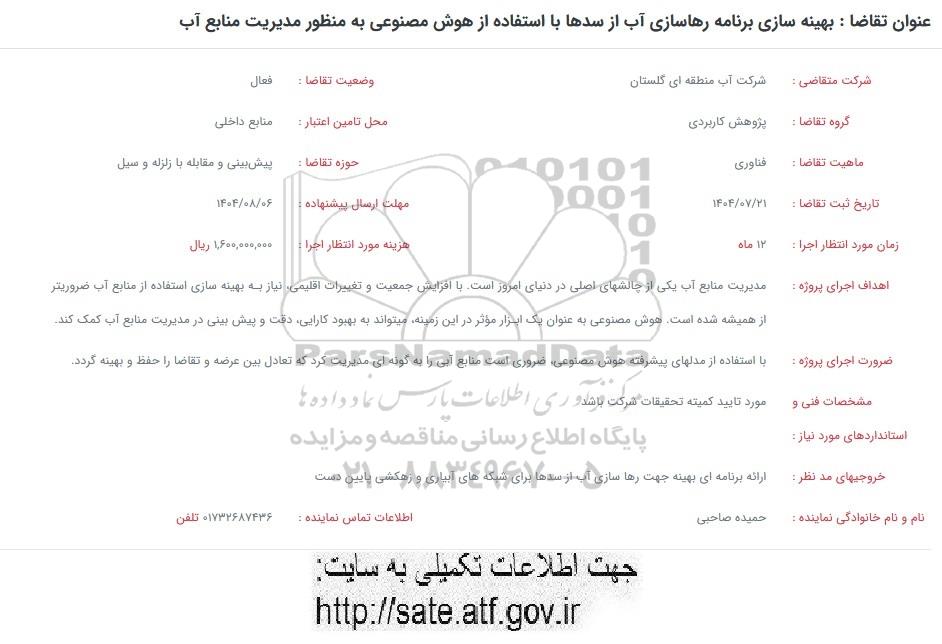 فراخوان بهینه سازی برنامه رهاسازی آب از سدها با استفاده از هوش مصنوعی به منظور مدیریت منابع آب از کلیه افراد متخصص و شرکتها واجد شرایط دعوت به عمل میآید در مناقصه با کد خبرگزاری پارس نماد: 9706294 شرکت نمایند.