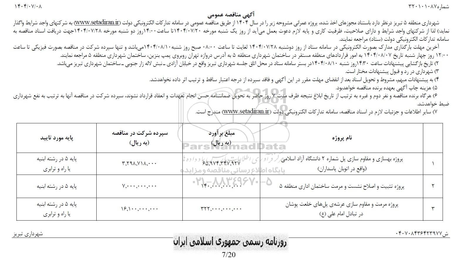 1 پروژه بهسازی و مقاوم سازی پل شماره 2 دانشگاه آزاد اسلامی (واقع در اتوبان پاسداران) 65.974.347.927 3.298.718.000 پایه 5 در رشته ابنیه یا راه و ترابری