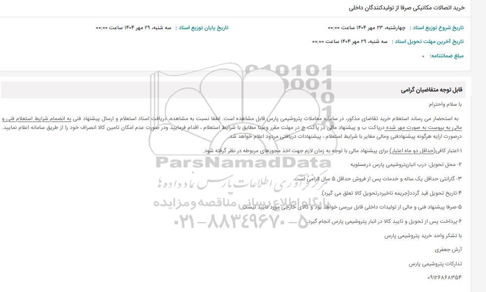 به استحضار میرساند استعلام خرید تقاضای مذکور در سامانه معاملات پتروشیمی پارس قابل مشاهده است. لطفا نسبت به مشاهده دریافت اسناد استعلام و ارسال پیشنهاد فنی به انضمام شرایط استعلام فنی و مالی به پیوست به صورت مهر شده در پاکت به و پیشنهاد مالی در پاکت ج در مهلت مقرر وعينا مطابق با شرایط استعلام اقدام فرمایید و در صورت عدم امکان تامین کالا انصراف خود را از طریق سامانه اعلام نمایید. در صورت ارایه هرگونه پیشنها دفنی و مالی مغایر با شرایط استعلام پیشنهادات دریافتی مردود اعلام خواهد شد.