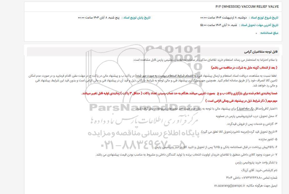استعلام بها و موضوع استعلام استعلام P.F (WHESSOE) VACCUM RELIEF VALVE به اطلاع کلیه شرکتها و افراد متخصص واجد شرایط میرساند، آگهی گذار در نظر دارد از طریق استعلام بها، نسبت به انتخاب و دریافت پیشنهادات اقدام نماید. این استعلام با کد آگهی ثبت شده در سامانه خبرگزاری پارس نماد : 9706348 منتشر شده است. مشخصات استعلام : تاریخ شروع استعلام: 1404/07/23 آخرین مهلت ارسال پیشنهاد قیمت : 1404/08/08 و محل اجرای پروژه : استان بوشهر میباشد. استعلام قیمت مورد درخواست : استعلام P.F (WHESSOE) VACCUM RELIEF VALVE با دستهبندیهای تخصصی و گروه های مرتبط : شیرآلات, تجهیزات نفت و گاز, استعلام اطلاع رسانی میگردد.