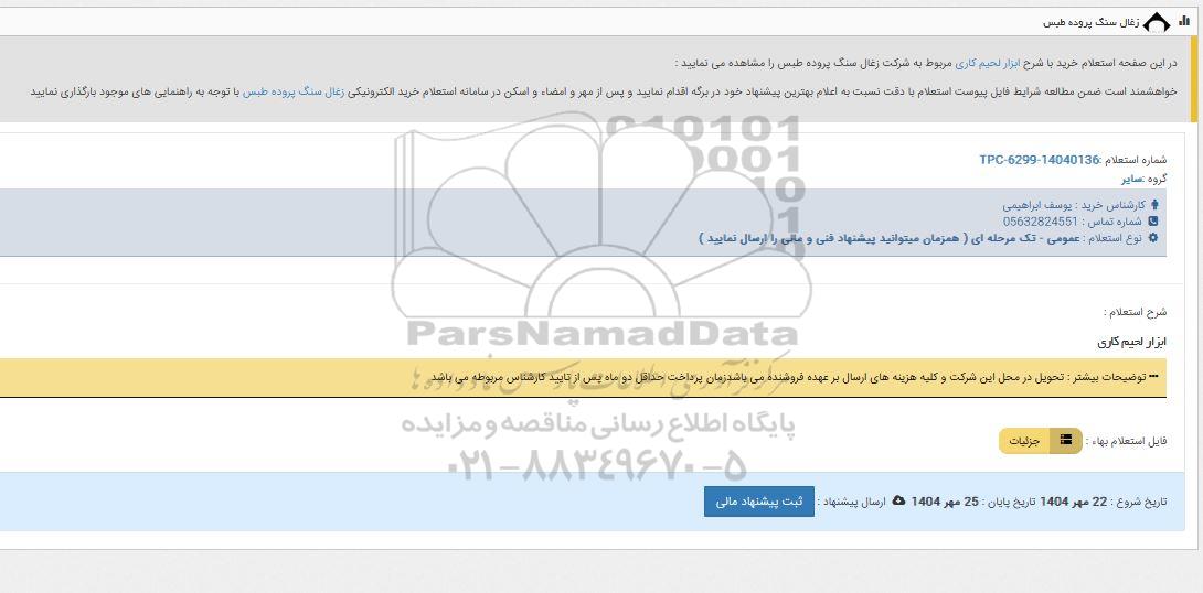 در این صفحه استعلام خرید با شرح ابزار لحیم کاری مربوط به شرکت زغال سنگ پروده طبس را مشاهده می نمایید: