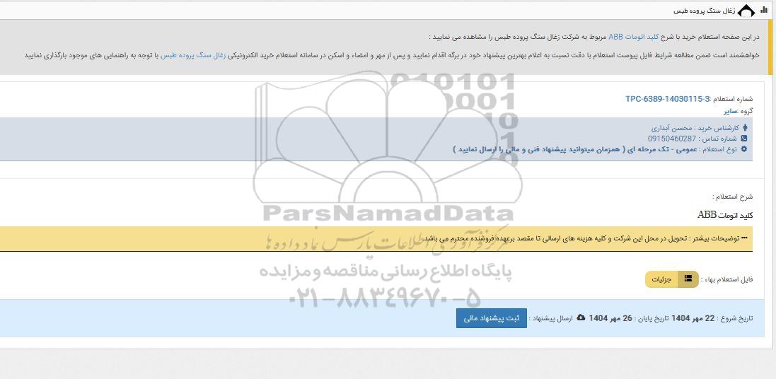 در این صفحه استعلام خرید با شرح کلید اتومات ABB مربوط به شرکت زغال سنگ پروده طبس را مشاهده می نمایید: