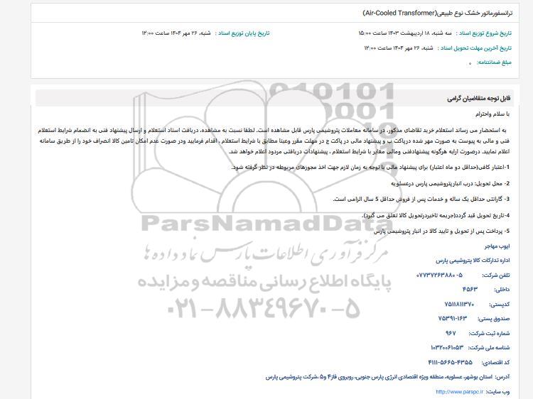 استعلام ترانسفورماتور خشک نوع طبیعی, استعلام ترانسفورماتور خشک نوع طبیعی