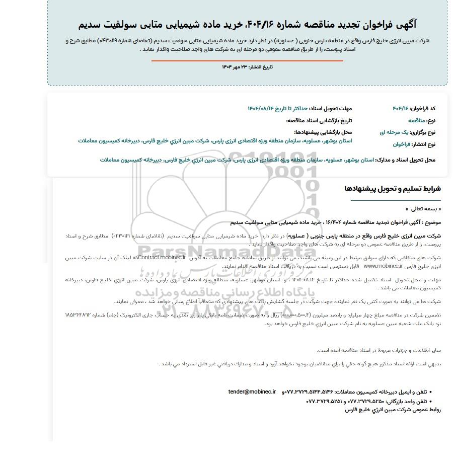 موضوع : آگهی فراخوان مناقصه شماره 16.404 ، خرید ماده شیمیایی متابی سولفیت سدیم