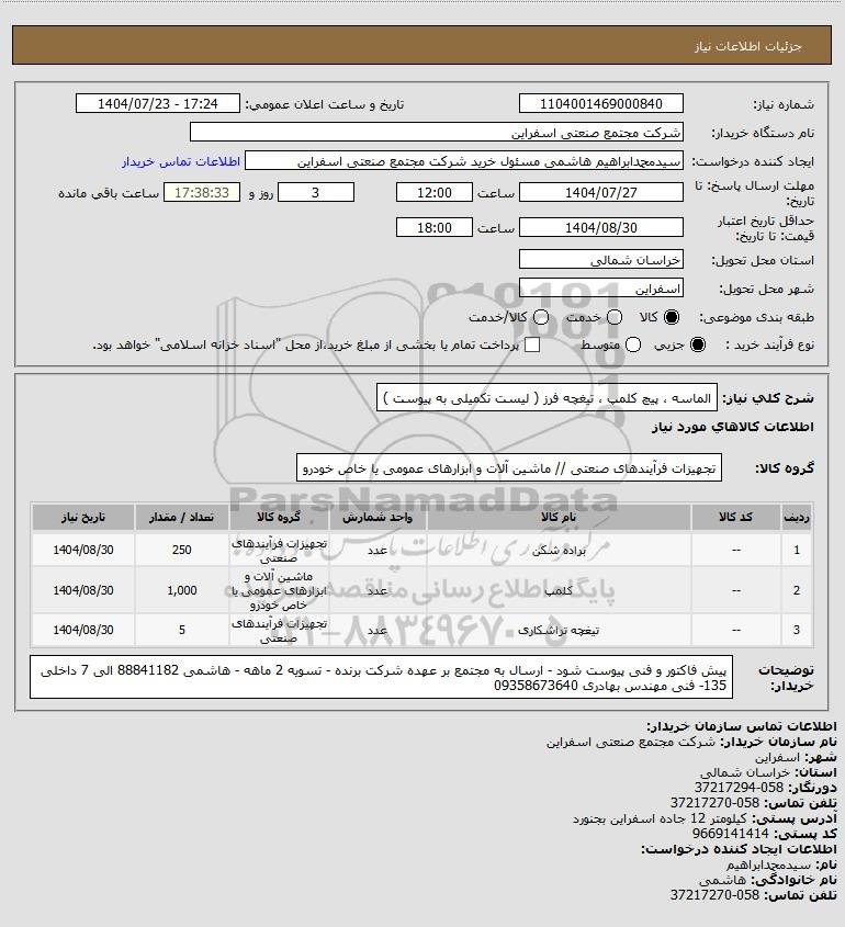 نام دستگاه خریدار:شرکت مجتمع صنعتی اسفراین