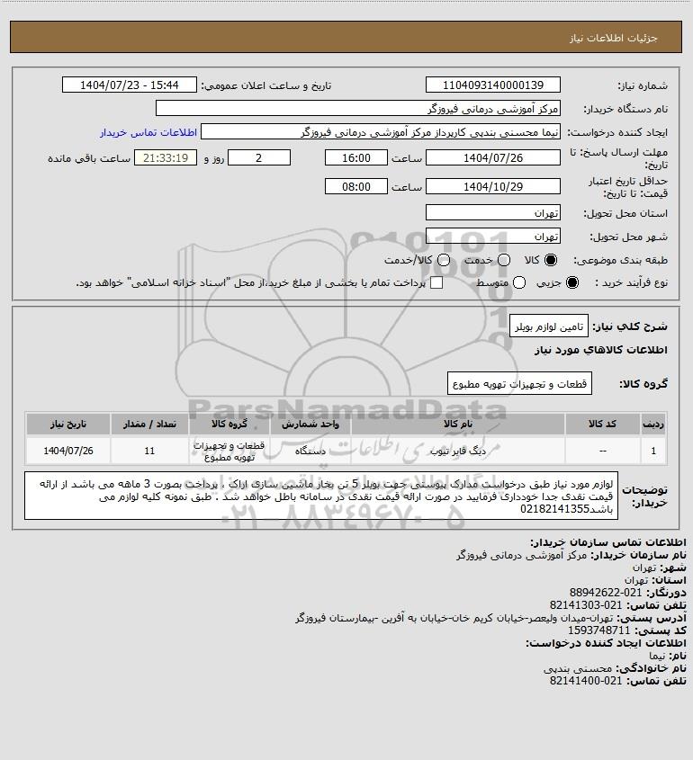 1 | -- | دیگ فایر تیوب | دستگاه | قطعات و تجهیزات تهویه مطبوع | 11 | 1404/07/26 |