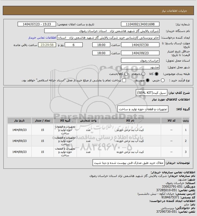 نام دستگاه خریدار:شرکت پالایش گاز شهید هاشمی نژاد استان خراسان رضوی