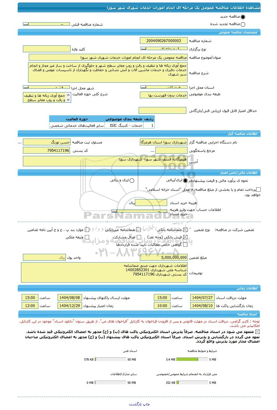 نام دستگاه اجرایی مناقصه گزار | شهرداری سوزا استان هرمزگان | مسئول ثبت مناقصه | حسن تورنگ |
