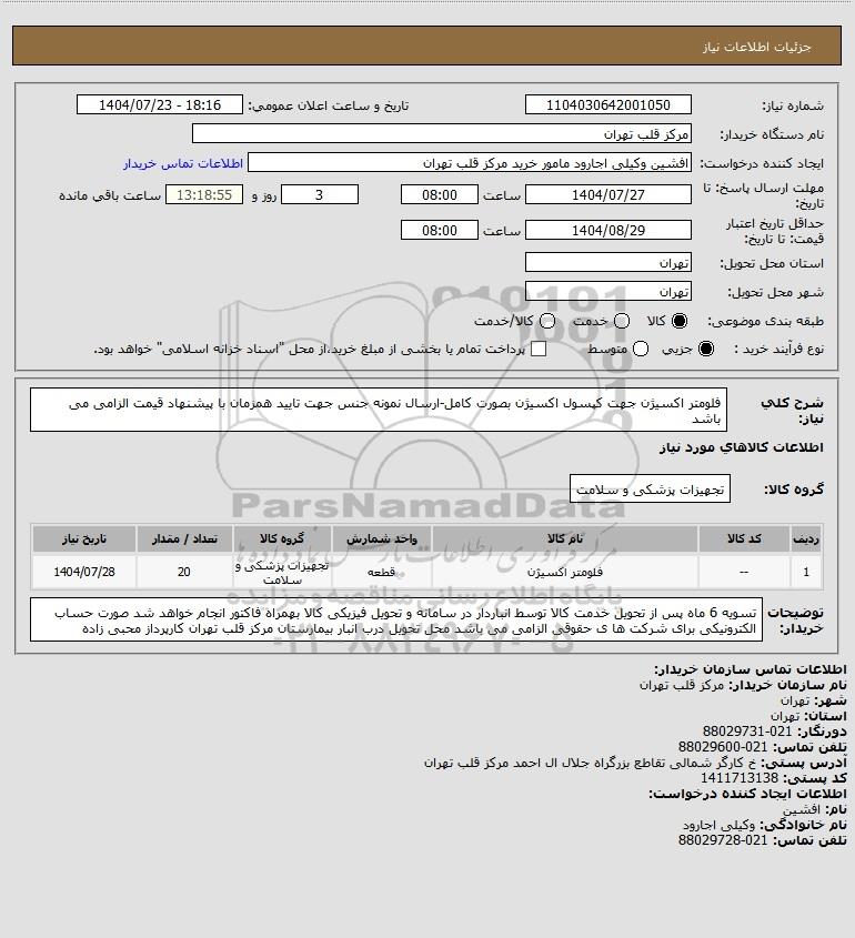 استعلام بها و موضوع استعلام استعلام فلومتر اکسیژن جهت کپسول اکسیژن بصورت کامل-ارسال نمونه جنس جهت تایید همزمان با پیشنهاد قیمت الزامی می باشد به اطلاع کلیه شرکت‌ها و افراد متخصص واجد شرایط می‌رساند، آگهی گذار در نظر دارد از طریق استعلام بها، نسبت به انتخاب و دریافت پیشنهادات اقدام نماید. این استعلام با کد آگهی ثبت شده در سامانه خبرگزاری پارس نماد : 9706741 منتشر شده است. مشخصات استعلام : تاریخ شروع استعلام: 1404/07/23 آخرین مهلت ارسال پیشنهاد قیمت : 1404/07/27 و محل اجرای پروژه : استان تهران میباشد. استعلام قیمت مورد درخواست : استعلام فلومتر اکسیژن جهت کپسول اکسیژن بصورت کامل-ارسال نمونه جنس جهت تایید همزمان با پیشنهاد قیمت الزامی می باشد با دسته‌بندی‌های تخصصی و گروه های مرتبط : خدمات و تجهیزات آزمایشگاهی و پزشکی, استعلام اطلاع رسانی میگردد. شرایط شرکت در استعلام آنلاین : ابتدا ثبت نام در سامانه استعلام پارس نماد و تکمیل مدارک موردنیاز و بارگذاری در سامانه رعایت تمامی ضوابط و الزامات مندرج در اسناد استعلام است.