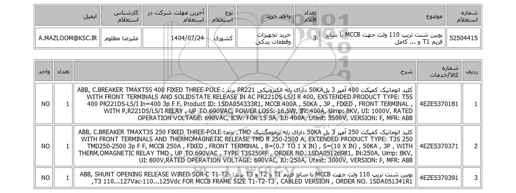 | 52504415 | بوبین شنت تریپ 110 ولت جهت MCCB با سایز فریم T1 و ... کامل | 3 | خرید تجهیزات وقطعات یدکی | کشوری | 1404/07/24 | علیرضا مظلوم | A.MAZLOOM@KSC.IR |