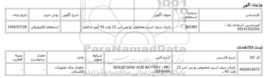 استعلام الکترونیکی باتری سیلد اسید مخصوص یو پی اس 12 ولت 42 آمپر ساعت, استعلام الکترونیکی، باتری سیلد اسید مخصوص یو پی اس 12 ولت 42 آمپر ساعت