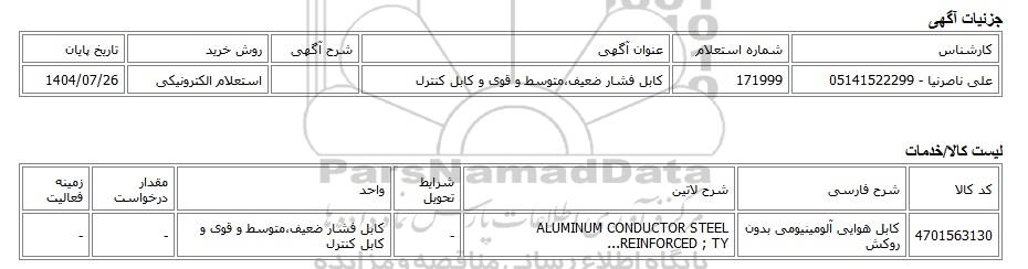 | علی ناصرنیا - 05141522299 | 171999 | کابل فشار ضعیف،متوسط و قوی و کابل کنترل | استعلام الکترونیکی | 1404/07/26 |