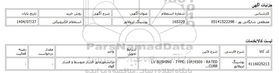 مصطفی شایگانی پور - 05141522298165329بوشینگ ایزولاتوراستعلام الکترونیکی1404/07/27