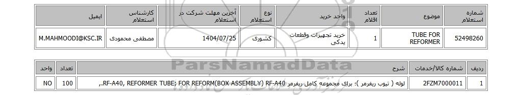 52498260TUBE FOR REFORMER 1خرید تجهیزات وقطعات یدکیکشوری1404/07/25مصطفی محمودیM.MAHMOODI@KSC.IR