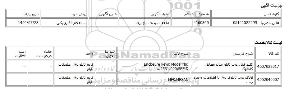 | علی ناصرنیا - 05141522299 | 160345 | ملحقات بدنه تابلو برق | استعلام الکترونیکی | 1404/07/23 |