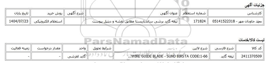| محمد جاودان مهر - 05141522318 | 171824 | تیغه گاید برشی ساندباریستا مظابق نقشه و دیتیل پیوست | استعلام الکترونیکی | 1404/07/23 |