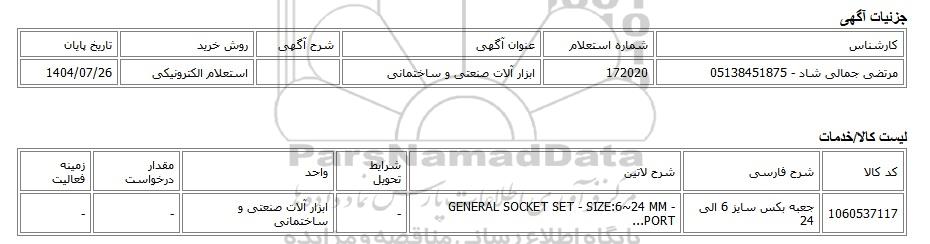 مرتضی جمالی شاد - 05138451875172020ابزار آلات صنعتی و ساختمانیاستعلام الکترونیکی1404/07/26