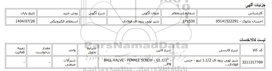 | احسان چابوک - 05141522291 | 171530 | شیر توپی رزوه ای فولادی | استعلام الکترونیکی | 1404/07/26 |