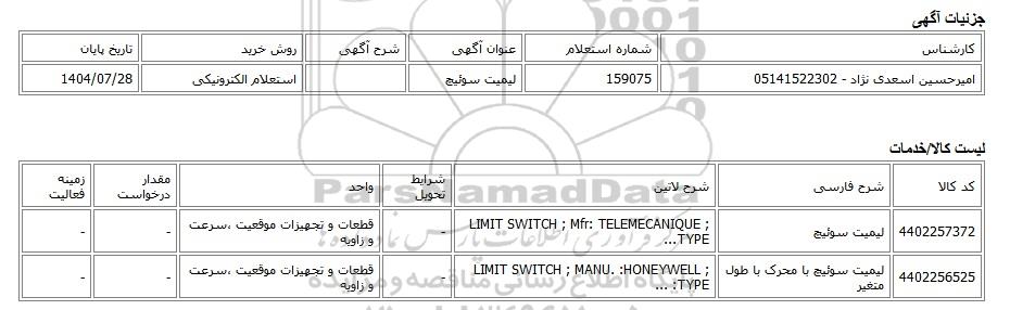 | امیرحسین اسعدی نژاد - 05141522302 | 159075 | لیمیت سوئیچ | استعلام الکترونیکی | 1404/07/28 |