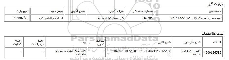 | امیرحسین اسعدی نژاد - 05141522302 | 162705 | کلید بریکر فشار ضعیف | استعلام الکترونیکی | 1404/07/28 |