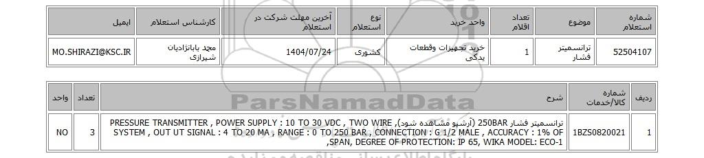 | 52504107 | ترانسمیتر فشار | 1 | خرید تجهیزات وقطعات یدکی | کشوری | 1404/07/24 | محمد بابانژادیان شیرازی | MO.SHIRAZI@KSC.IR |