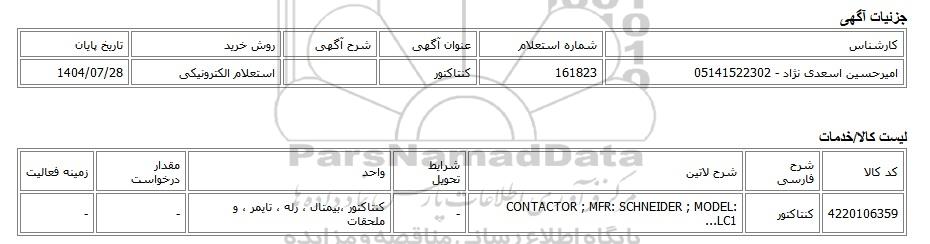 | امیرحسین اسعدی نژاد - 05141522302 | 161823 | کنتاکتور | استعلام الکترونیکی | 1404/07/28 |
