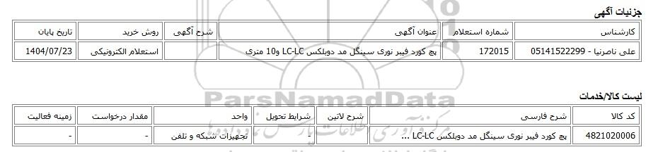 علی ناصرنیا - 05141522299 | 172015 | پچ کورد فیبر نوری سینگل مد دوبلکس LC-LC و10 متری | استعلام الکترونیکی | 1404/07/23 |
