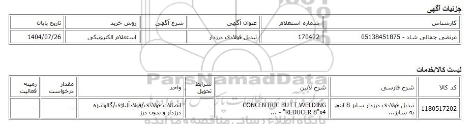 | مرتضی جمالی شاد - 05138451875 | 170422 | تبدیل فولادی درزدار | استعلام الکترونیکی | 1404/07/26 |
