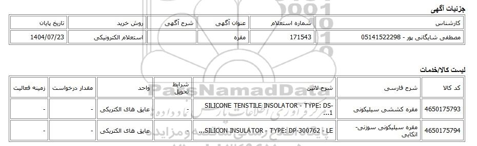 4650175793 | مقره کششی سیلیکونی | SILICONE TENSTILE INSOLATOR - TYPE: DS-1... | - | عایق های الکتریکی | - | - |