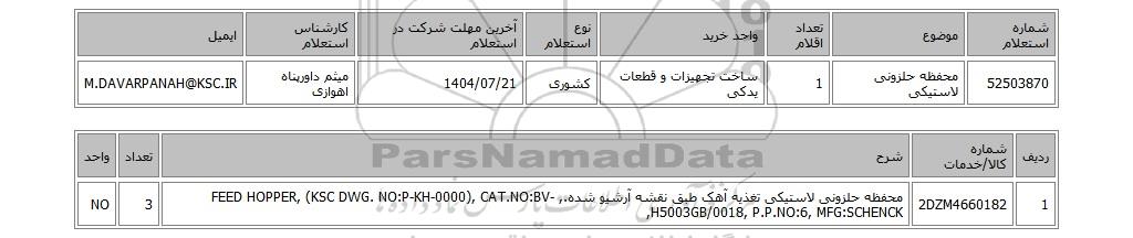 52503870محفظه حلزونی لاستیکی1ساخت تجهیزات و قطعات یدکیکشوری1404/07/21میثم داورپناه اهوازیM.DAVARPANAH@KSC.IR