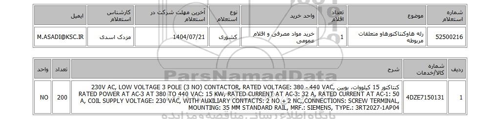 52500216رله هاوکنتاکتورهاو متعلقات مربوطه1خرید مواد مصرفی و اقلام عمومیکشوری1404/07/21مزدک اسدیM.ASADI@KSC.IR