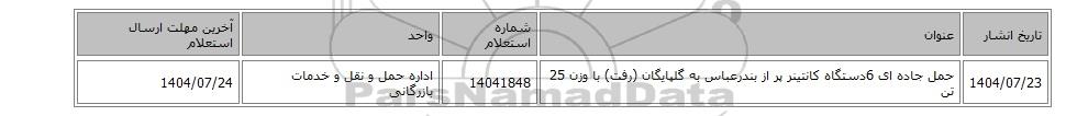 | 1404/07/23 | حمل جاده ای 6دستگاه کانتینر پر از بندرعباس به گلپایگان (رفت) با وزن 25 تن | 14041848 | اداره حمل و نقل و خدمات بازرگانی | 1404/07/24 |