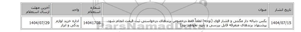 | 1404/07/15 | بکس دنباله دار مگنتی و فشار قوی (توجه! لطفاً فقط درخصوص برندهای درخواستی ثبت قیمت انجام شود، پیشنهاد برندهای متفرقه قابل بررسی و تأیید نخواهد بود) | 14041708 | اداره خرید لوازم یدکی و ابزار | 1404/07/29 |