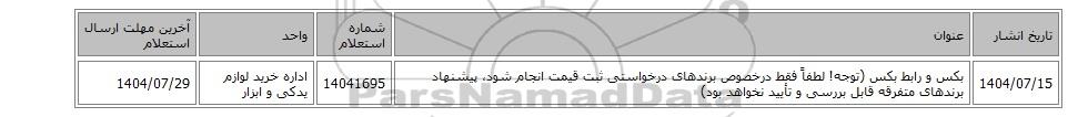 | 1404/07/15 | بکس و رابط بکس (توجه! لطفاً فقط درخصوص برندهای درخواستی ثبت قیمت انجام شود، پیشنهاد برندهای متفرقه قابل بررسی و تأیید نخواهد بود) | 14041695 | اداره خرید لوازم یدکی و ابزار | 1404/07/29 |